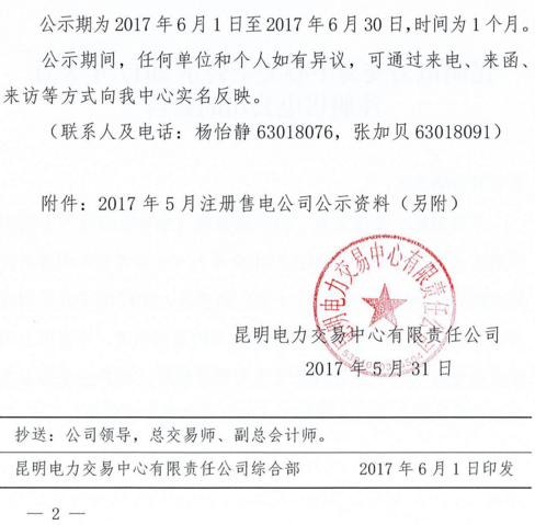 昆明電力交易中心關于公示2017年5月注冊售電公司的公告