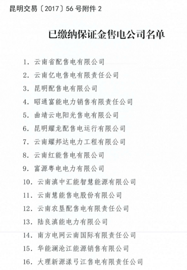 昆明電力交易中心發(fā)布了《關(guān)于公布2017年6月售電企業(yè)目錄的通知》,包含4月新增注冊(cè)11家售電公司,售電公司目錄已有43家,已繳納保證金售電公司有16家。詳情如下: