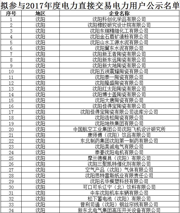 遼寧省經(jīng)信委7月6日發(fā)布了《關(guān)于擬參與2017年度電力直接交易電力用戶(hù)準(zhǔn)入名單的公示》,本次新增電力用戶(hù)準(zhǔn)入名單公示分兩批進(jìn)行,初步確定新增沈陽(yáng)科創(chuàng)化學(xué)品有限公司等第一批206戶(hù)企業(yè)參與本年度電力直接交易,詳情如下: