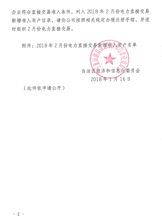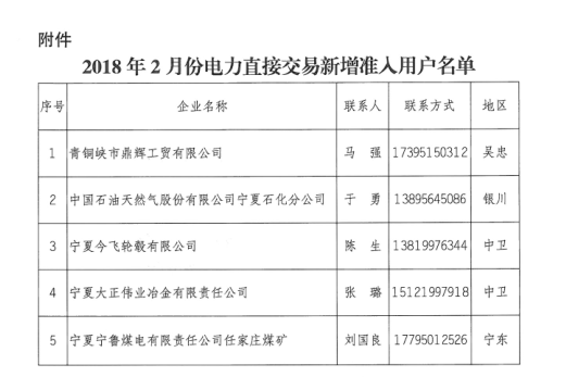 寧夏2018年2月電力直接交易新增準入用戶名單