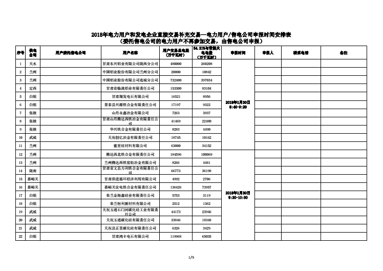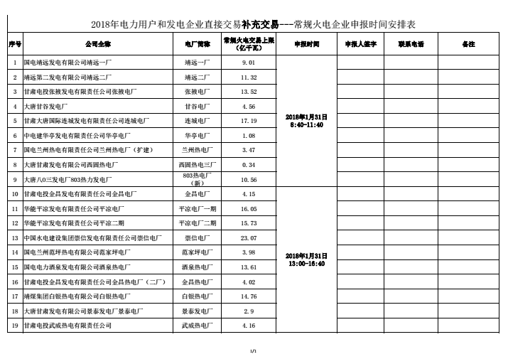 《補(bǔ)充交易申報(bào)時(shí)間表-2018年甘肅省大用戶(hù)直購(gòu)電(常規(guī)火電企業(yè))申報(bào)時(shí)間安排表》