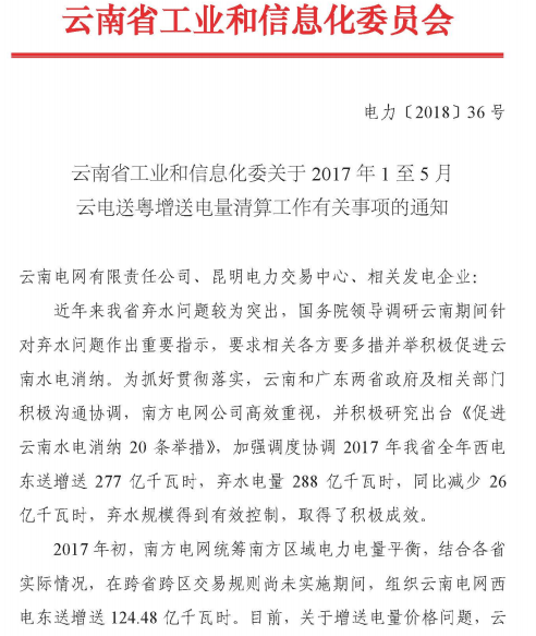 云南省工業(yè)和信息化委員會(huì)日前發(fā)布《關(guān)于2017年1至5月云電送粵增送電量清算工作有關(guān)事項(xiàng)的通知》指出: