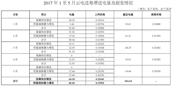 《2017年1至5月云電送粵增送電量及超發(fā)情況》