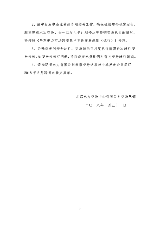 北京電力交易中心有限公司交易三部于2018年1月30日組織了2018年2月安徽購福建跨省集中交易。