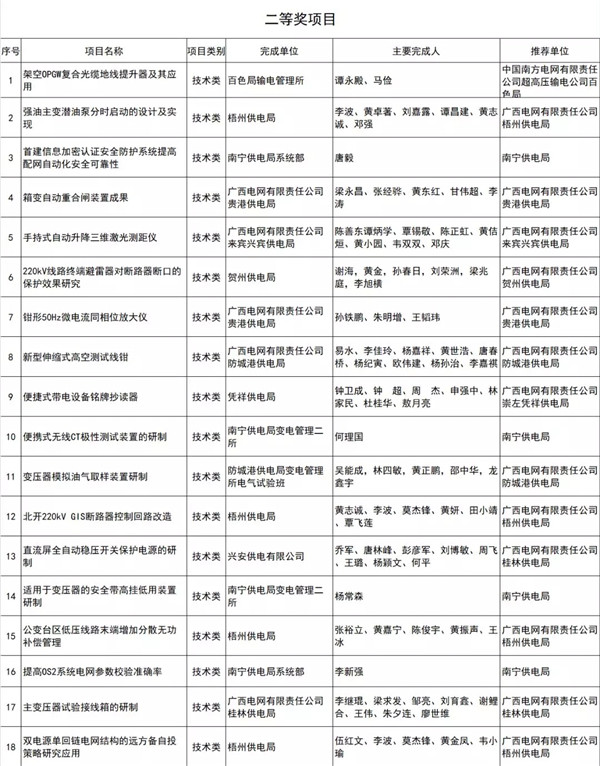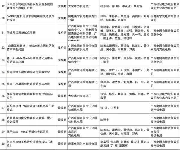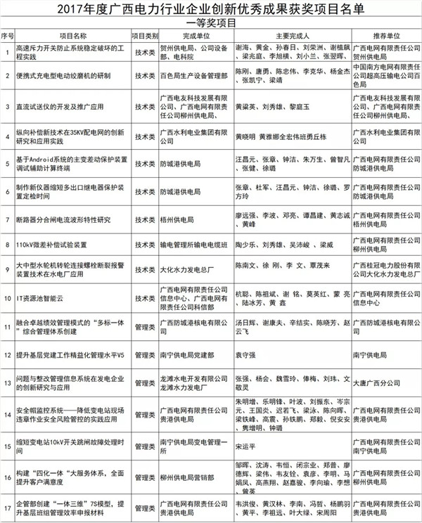 近日,廣西電力行業(yè)協(xié)會公示電力行業(yè)企業(yè)創(chuàng)新優(yōu)秀成果評審結(jié)果,報送成果項(xiàng)目284項(xiàng),共評出管理創(chuàng)新類、技術(shù)創(chuàng)新類一、二、三等獎項(xiàng)目96項(xiàng),QC、“五小”類項(xiàng)目優(yōu)秀獎69項(xiàng),合計(jì)165項(xiàng)。詳細(xì)情況如下:
