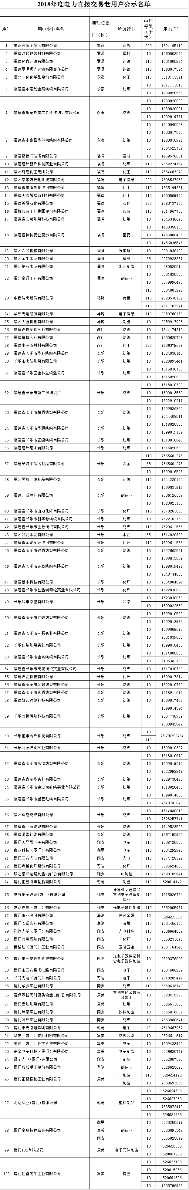 福建2018年度電力直接交易334家老用戶公示名單