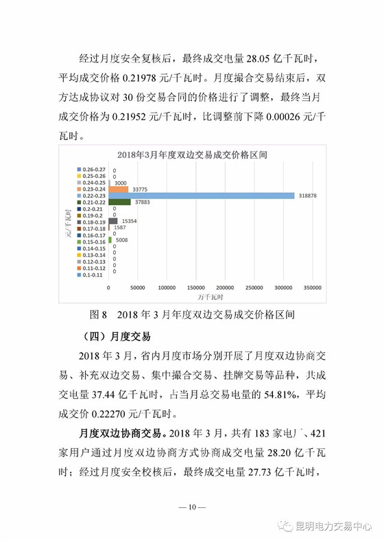 昆明電力交易中心日前發(fā)布了《云南電力交易月報(2018年3月)》,2018年2月,云南日前電量市場累計成交電量1.45億千瓦時,平均成交價0.19337元/千瓦時(電廠側),最高成交價0.203元/千瓦時,最低成交價0.168元/千瓦時。