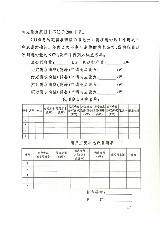 (三)及時簽訂需求響應(yīng)協(xié)議。交易成交的電力用戶,應(yīng)在5月底前與各市經(jīng)濟(jì)和信息化委、供電公司三方簽訂山東省電力需求響應(yīng)協(xié)議,協(xié)議確定的響應(yīng)時間應(yīng)在每年的6月1日至次年的5月31日。