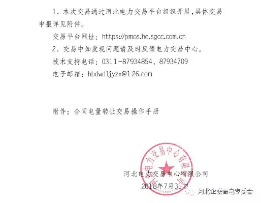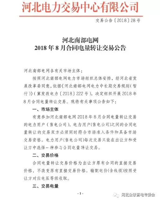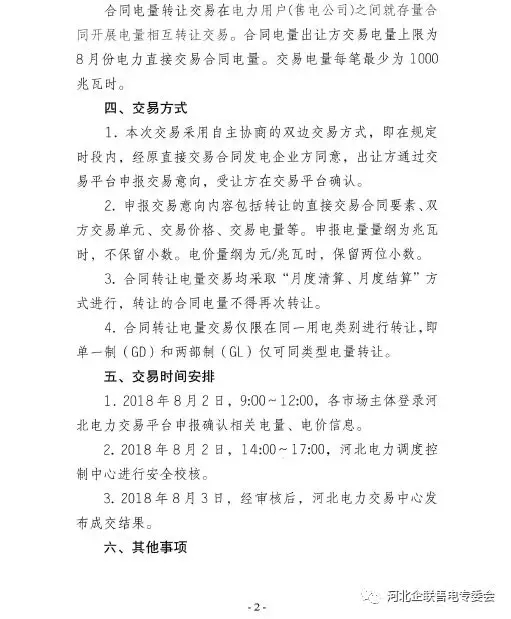 河北南部電網(wǎng)2018年8月份合同電量轉(zhuǎn)讓交易:于8月2日9時(shí)展開