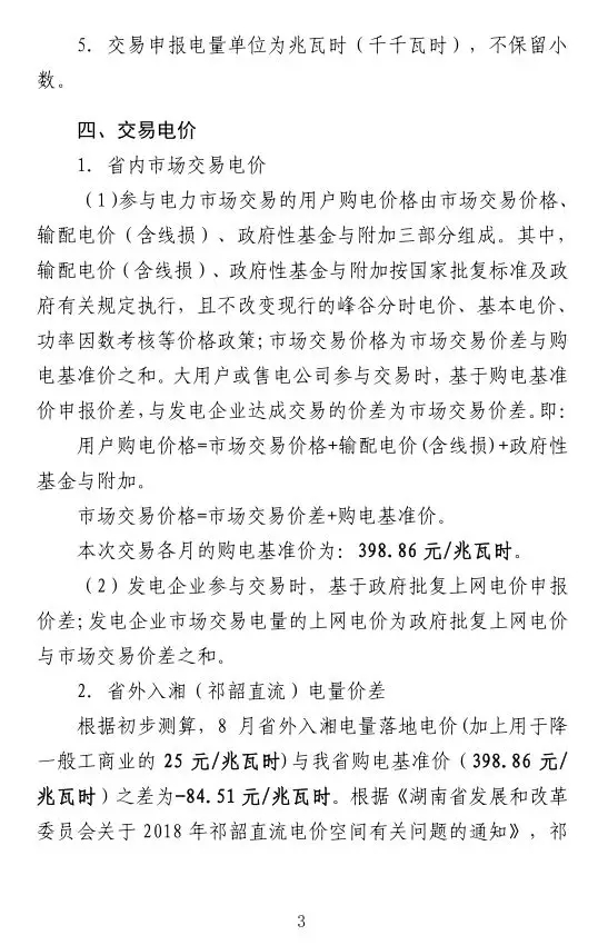 本次交易不設(shè)定月度總成交電量具體限額,以電力用戶、售電公司當(dāng)月需求為限。本次交易各月的購電基準(zhǔn)價(jià)為:398.86元/兆瓦時(shí)。2018年8月省外入湘(祁韶直流)電量為11.5億千瓦時(shí)。詳情如下:
