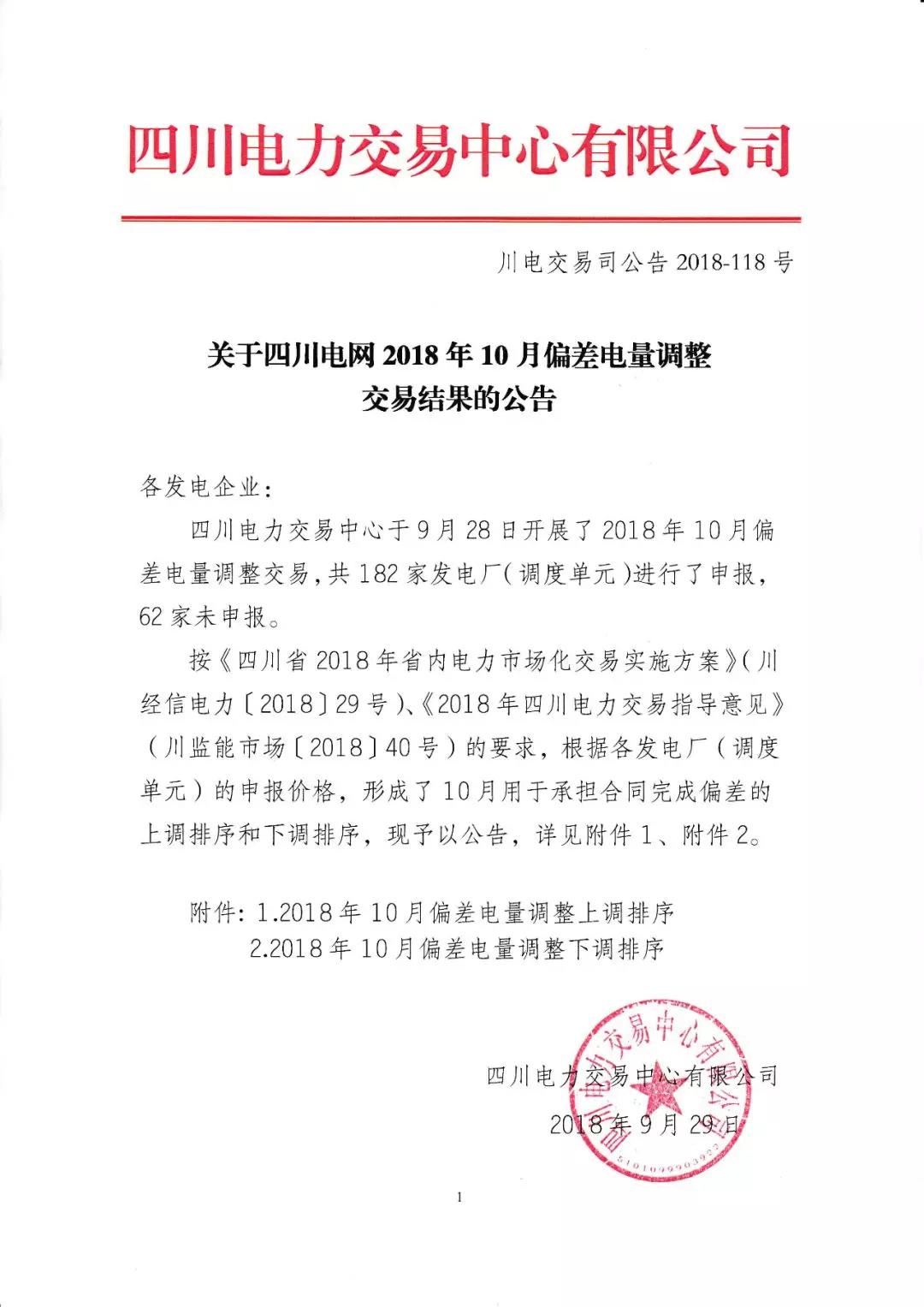 公告 | 關(guān)于四川電網(wǎng)2018年10月偏差電量調(diào)整交易結(jié)果的公告