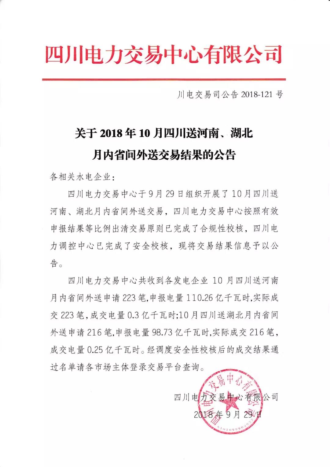 公告 | 關(guān)于2018年10月四川送河南、湖北月內(nèi)省間外送交易結(jié)果的公告