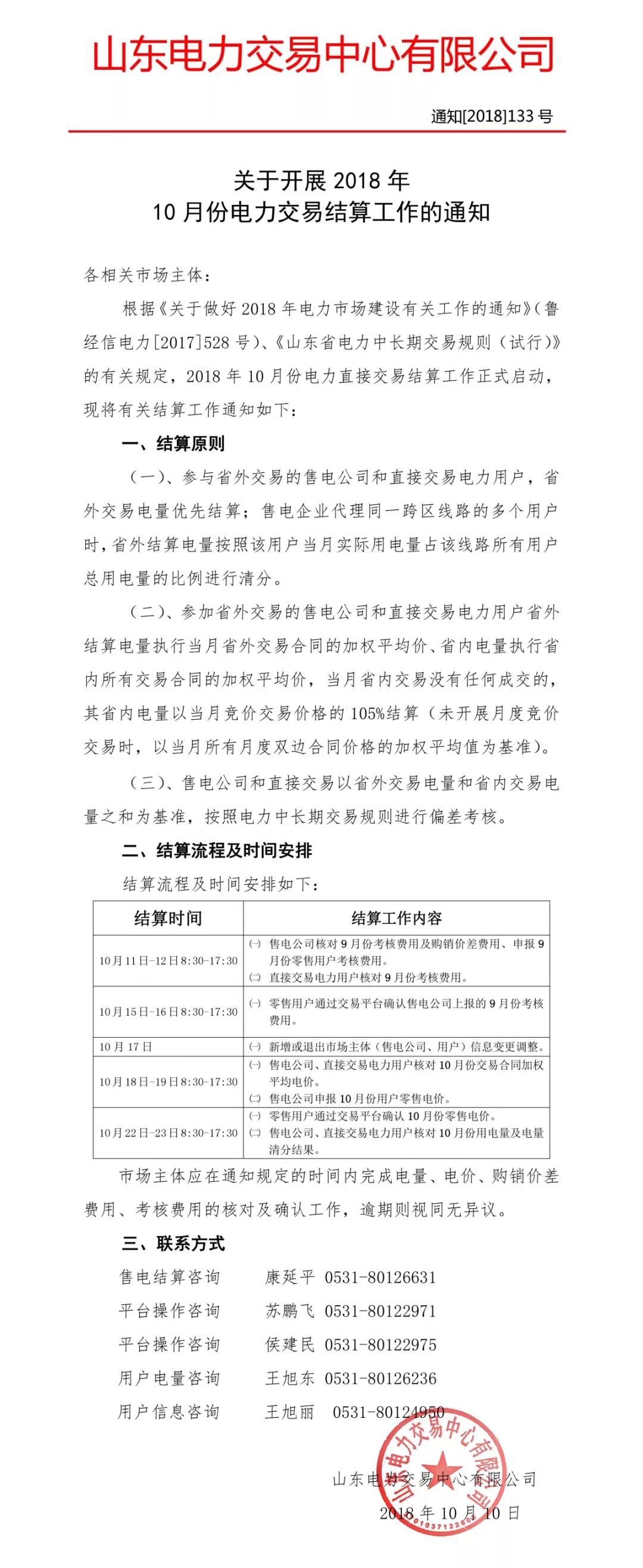 山東關(guān)于開展2018年10月份電力交易結(jié)算工作的通知