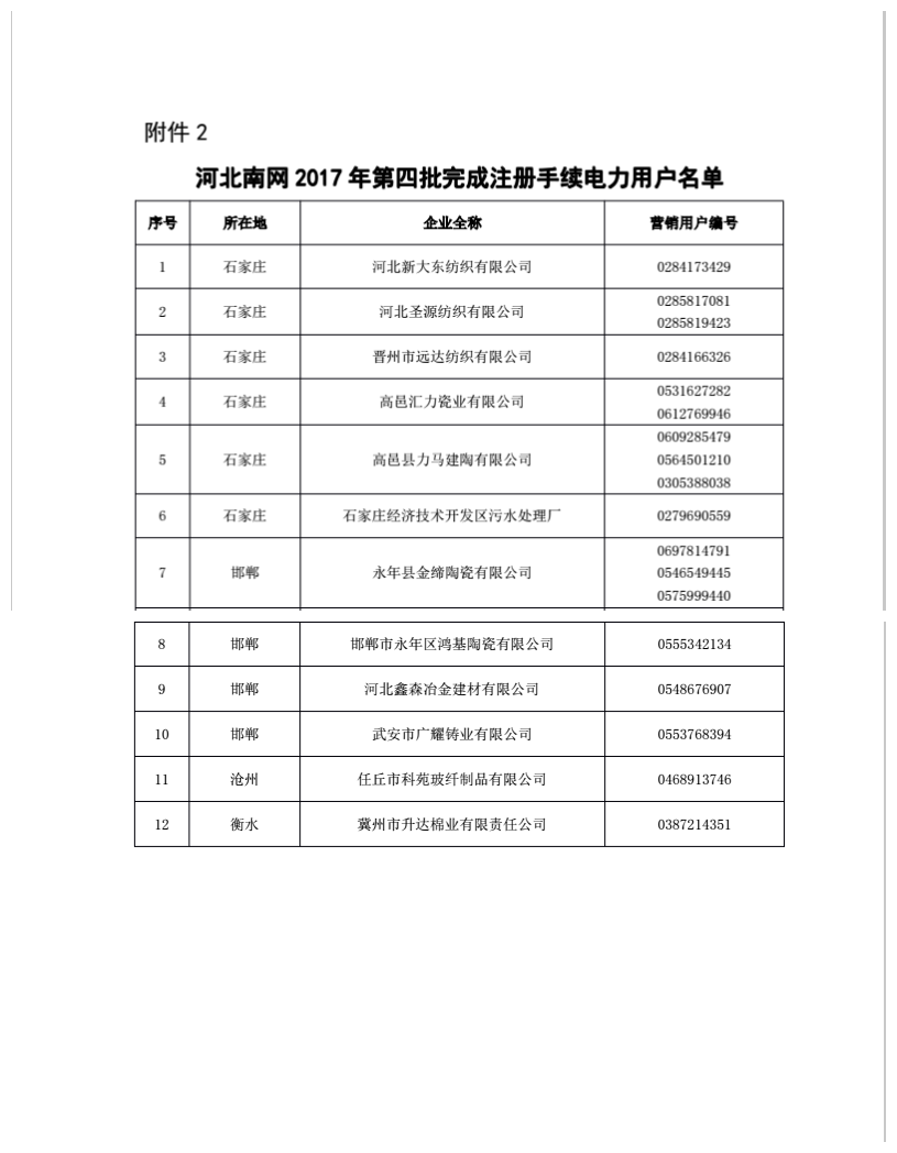 2.河北南網(wǎng)2017年第四批完成注冊手續(xù)電力用戶名單