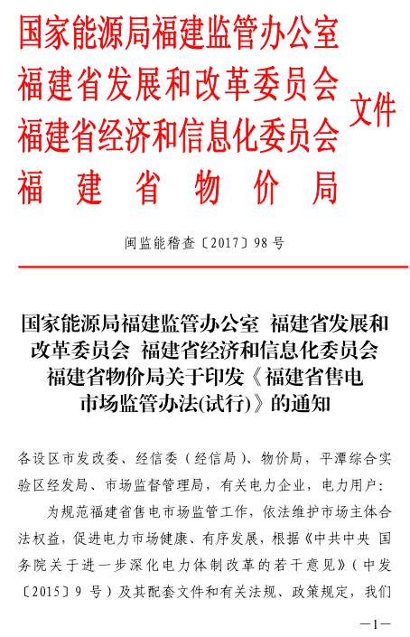 福建省售電市場監(jiān)管辦法(試行)印發(fā)