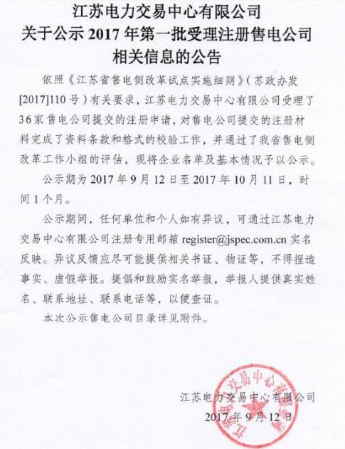 2017年9月12日,江蘇省電力交易中心9月8日開始的第一批售電公司注冊工作有了明顯的進展,第一批36家售電公司在交易中心開始公示。公示期為2017年9月12日至2017年10月11日,時間1個月。