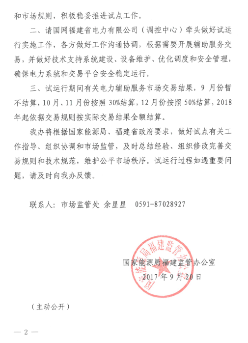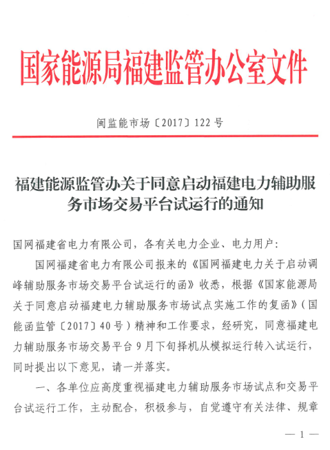 福建能源監(jiān)管辦9月20日發(fā)布了《關(guān)于同意啟動福建電力輔助服務(wù)市場交易平臺試運行的通知》,通知中稱,同意福建電力輔助服務(wù)市場交易平臺9月下旬擇機從模擬運行轉(zhuǎn)入試運行。試運行期間有關(guān)電力輔助服務(wù)市場交易結(jié)