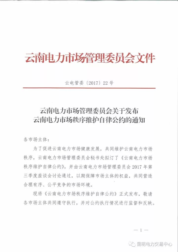 2017年10月11日,為了促進(jìn)云南電力市場公平有序競爭,共同維護(hù)云南電力市場秩序,云南電力市場管理委員會發(fā)布《云南電力市場秩序維護(hù)自律公約》。