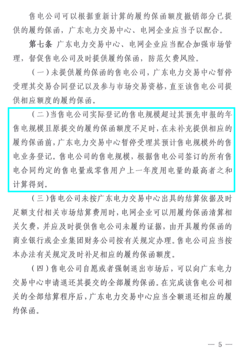 當售電公司實際登記的售電規(guī)模超過其預(yù)先申報的年售電規(guī)模且元提交的履約保函額度不足時,在未補充提供相應(yīng)的履約保函前,廣東電力交易中心暫停受理其預(yù)計售電規(guī)模外的售電業(yè)務(wù)登記。