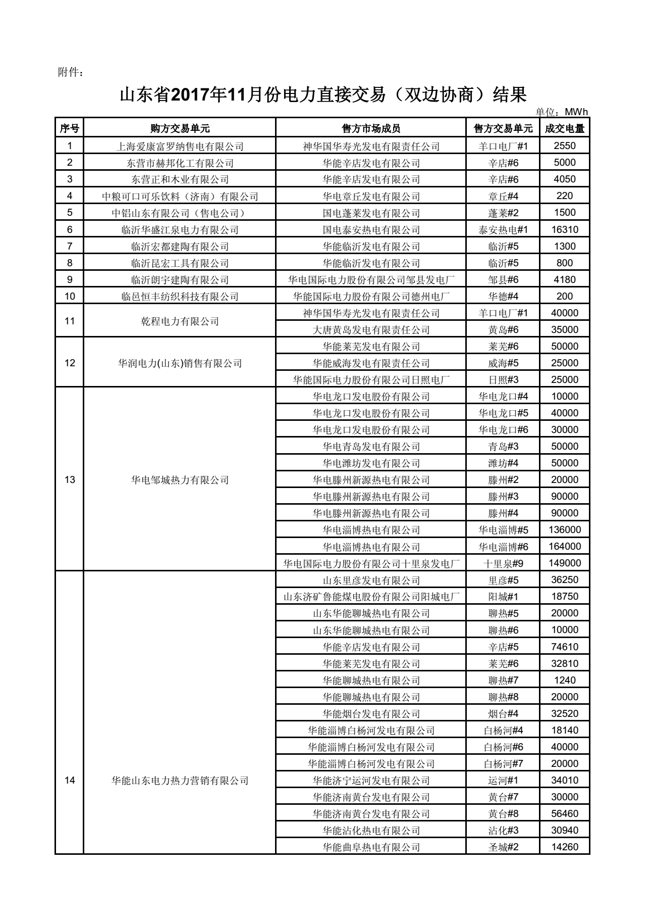 山東發(fā)布2017年11月份電力直接交易(雙邊協(xié)商)結(jié)果的公告