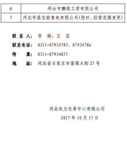 河北電力交易中心受理了河北萬煦售電有限公司等7家售電公司的注冊(cè)申請(qǐng),現(xiàn)將企業(yè)名單及基本情況予以公示。公示期為2017年10月17日至2017年11月16日,時(shí)間1個(gè)月。