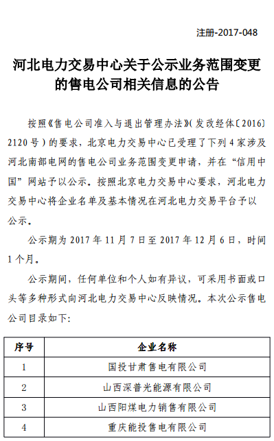 11月7日,河北電力交易中心發(fā)布了《關(guān)于公示業(yè)務(wù)范圍變更的售電公司相關(guān)信息的公告》,公告中稱,北京電力交易中心已受理了下列4家涉及河北南部電網(wǎng)的售電公司業(yè)務(wù)范圍變更申請,將企業(yè)名單及基本情況在河北電力交易平臺予以公示。