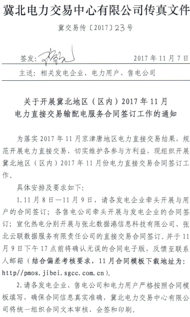 冀北發(fā)布開展2017年11月電力直接交易輸配電服務(wù)合同簽訂工作的通知