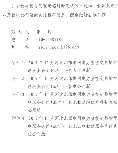 11月7日,冀北電力交易中心發(fā)布《關(guān)于開展冀北地區(qū)(區(qū)內(nèi))2017年11月電力直接交易輸配電服務(wù)合同簽訂工作的通知》,通知中稱11月8日至11月9日,請各發(fā)電企業(yè)牽頭開展與用戶的合同簽訂;各售電公司牽頭開展與大點(diǎn)企業(yè)的合同簽訂;宣化熱電分別開展與張北數(shù)據(jù)港信息科技有限公司、張北云聯(lián)數(shù)據(jù)服務(wù)有限責(zé)任公司的直接交易合同簽訂。
