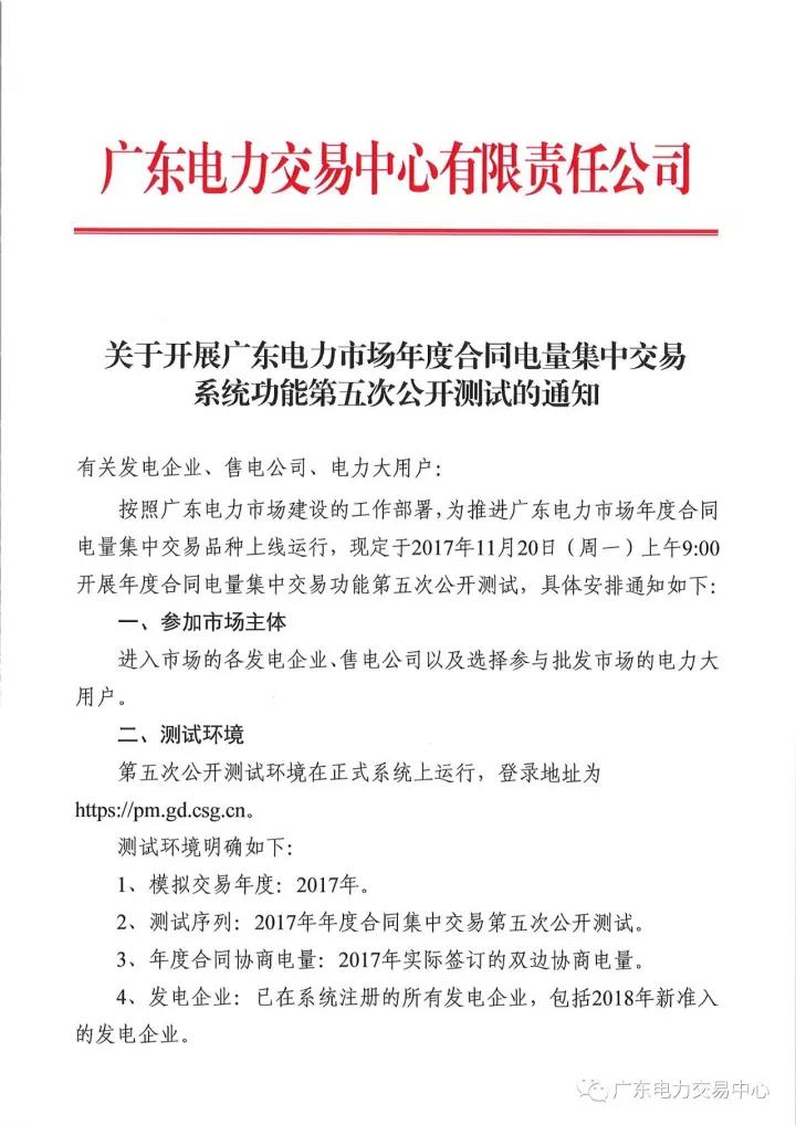 廣東《關(guān)于開(kāi)展廣東電力市場(chǎng)年度合同電量集中交易系統(tǒng)功能第五次公開(kāi)測(cè)試的通知》