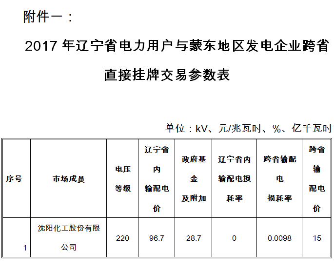 近日,遼寧電力交易中心發(fā)布了《關(guān)于開展2017年第5批遼寧省電力用戶與蒙東地區(qū)發(fā)電企業(yè)跨省直接交易的通知(沈陽化工 第一輪)》,通知稱本次交易參與的市場成員為經(jīng)政府有關(guān)部門核準(zhǔn)的電力用戶和火電企業(yè)。其中: