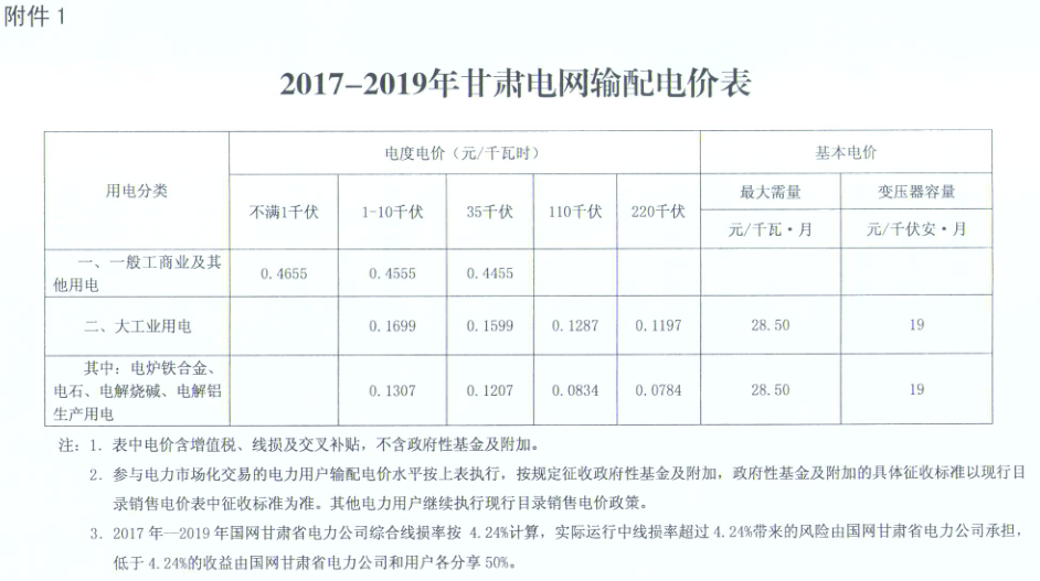 附件:1.2017-2019年甘肅電網(wǎng)輸配電價表