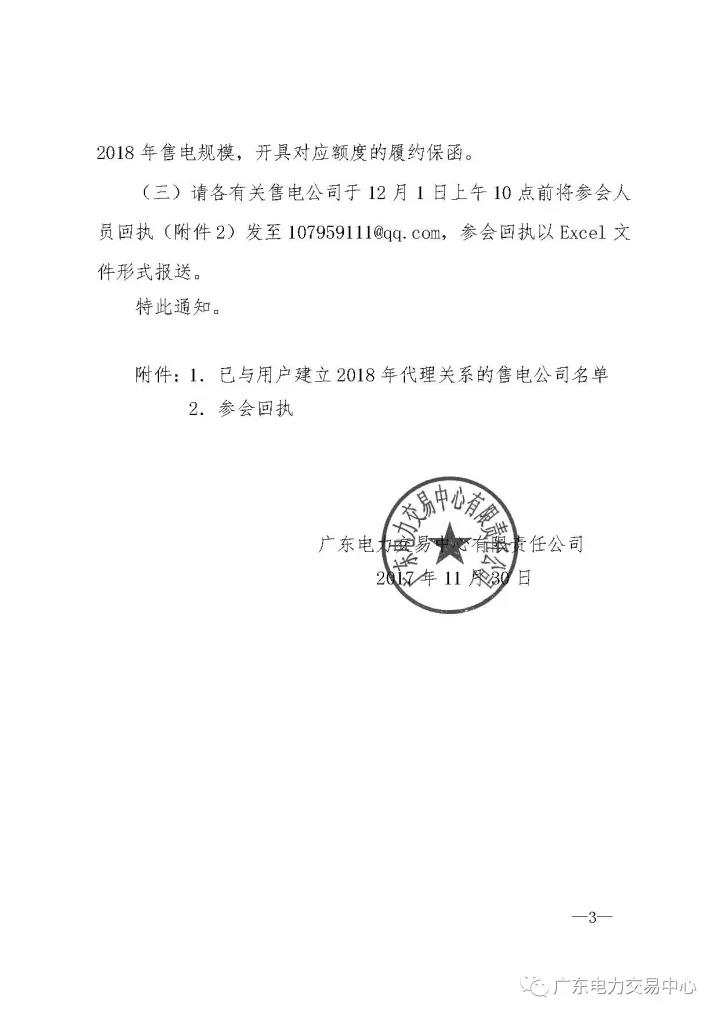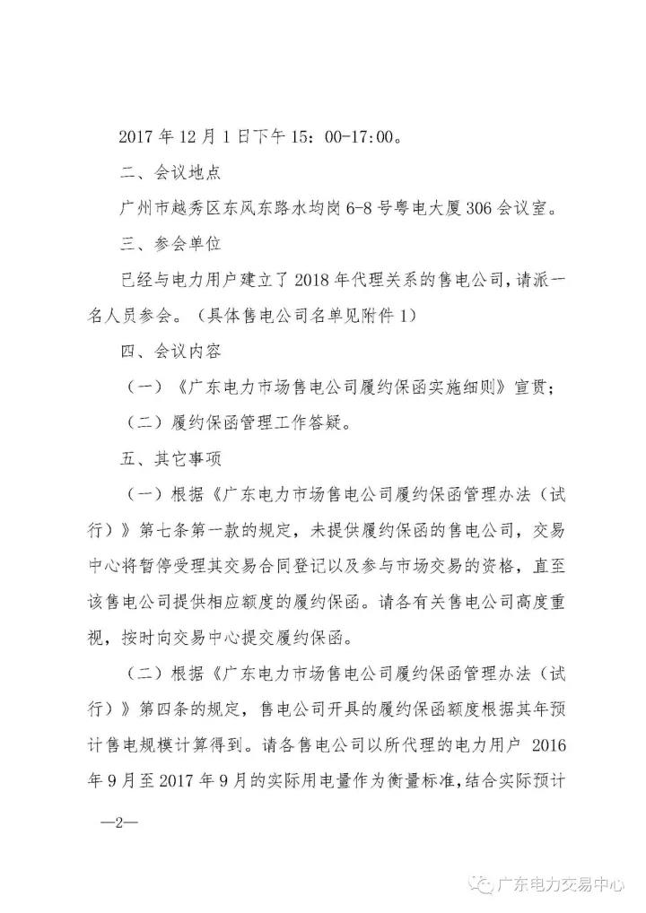 廣東電力交易中心日前發(fā)布了《《關(guān)于召開廣東電力市場(chǎng)售電公司履約保函工作交流會(huì)的通知》,通知中稱,為推動(dòng)履約保函工作順利開展,決定于12月1日下午15:00-17:00召開廣東電力市場(chǎng)售電公司履約保函工作交流會(huì)。參會(huì)單位為已經(jīng)與電力用戶建立了2018年代理關(guān)系的售電公司。詳情如下:
