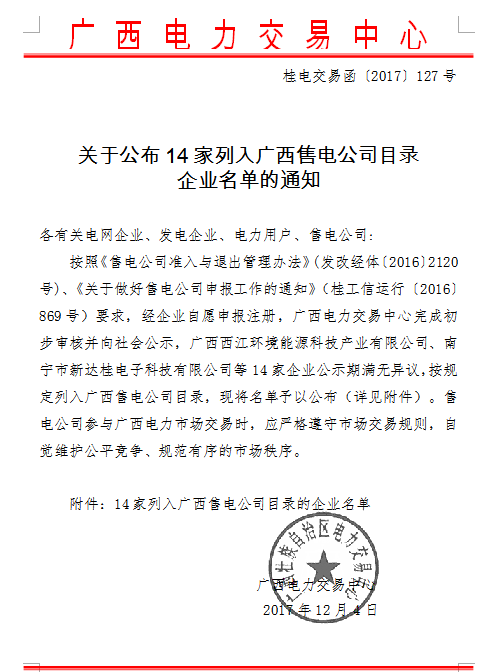 12月4日,廣西電力交易中心發(fā)布了《關(guān)于公布14家列入廣西售電公司目錄企業(yè)名單的通知》,通知稱經(jīng)企業(yè)自愿申報(bào)注冊,廣西電力交易中心完成初步審核并向社會公示,廣西西江環(huán)境能源科技產(chǎn)業(yè)有限公司、南寧市新達(dá)桂