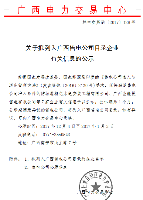 12月4日,廣西電力交易中心發(fā)布了《關(guān)于擬列入廣西售電公司目錄企業(yè)有關(guān)信息的公示》,稱現(xiàn)將滿足售電公司準(zhǔn)入條件的防城港精億水電安裝工程有限公司、廣西金能投售電有限公司等7家企業(yè)有關(guān)信息予以公示,公示期