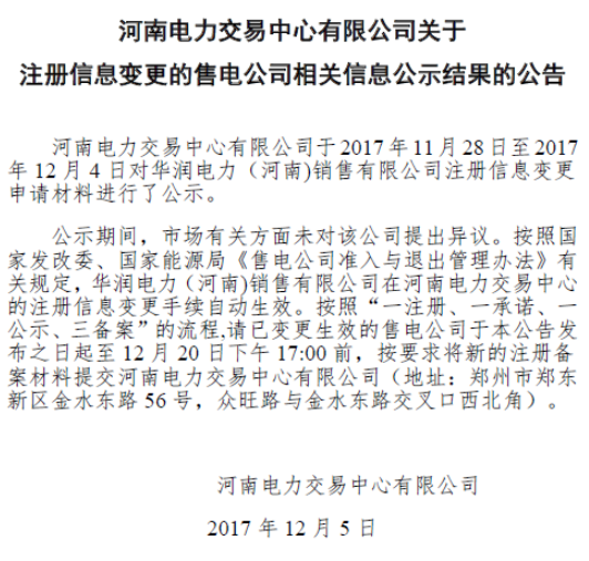 12月5日,河南電力交易中心發(fā)布了《關(guān)于注冊信息變更的售電公司相關(guān)信息公示結(jié)果的公告》,稱中心于11月28日至12月4日,對華潤電力(河南)銷售有限公司注冊信息變更申請材料進(jìn)行了公示,公示期間,市場方面無異議,注冊手續(xù)自動生效。