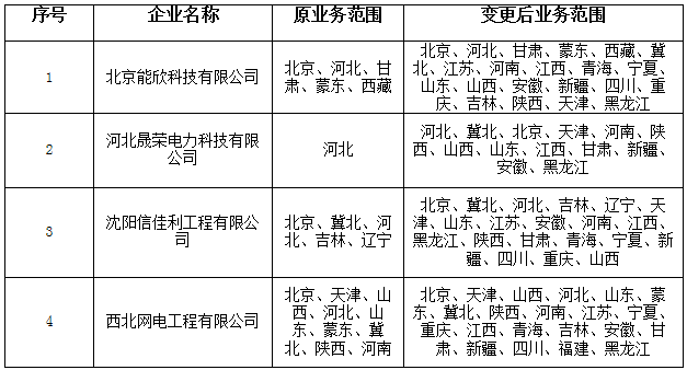 按照國家發(fā)改委、國家能源局《售電公司準(zhǔn)入與退出管理辦法》的要求,北京電力交易中心受理了下列4家涉及山西省有關(guān)業(yè)務(wù)售電公司的業(yè)務(wù)范圍變更申請(qǐng),并對(duì)售電公司提交的市場準(zhǔn)入申請(qǐng)材料進(jìn)行了完整性核驗(yàn)且予以公示。按照北京電力交易中心要求,現(xiàn)在我省予以公示。公示期為2017年12月13日至18年1月12日,時(shí)間1個(gè)月。