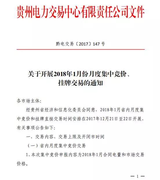 貴州電力交易中心日前發(fā)布了《關(guān)于開展2018年1月份月度集中競價、掛牌交易的通知》,通知中稱,2018年1月省內(nèi)月度集中競價和掛牌直接交易時間安排在2017年12月21日至22日開展。其中集中競價申報內(nèi)容為2018年1月合