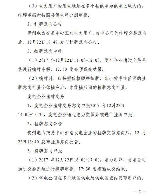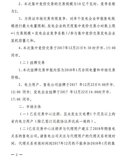 掛牌交易申報內(nèi)容為2018年1月合同電量和市場交易價格。電力用戶、售電公司掛牌于2017年12月22日9:00開市,12:00閉市;發(fā)電企業(yè)掛牌于2017年12月22日14:00時開市,17:00閉市。