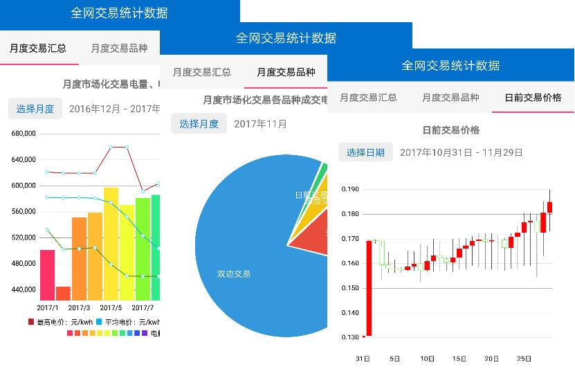 全網(wǎng)交易統(tǒng)計(jì)數(shù)據(jù)展示:提供包括月度量?jī)r(jià)數(shù)據(jù)、月度各交易品種分類統(tǒng)計(jì)及日前電量交易價(jià)格K線圖等市場(chǎng)交易數(shù)據(jù)展示;