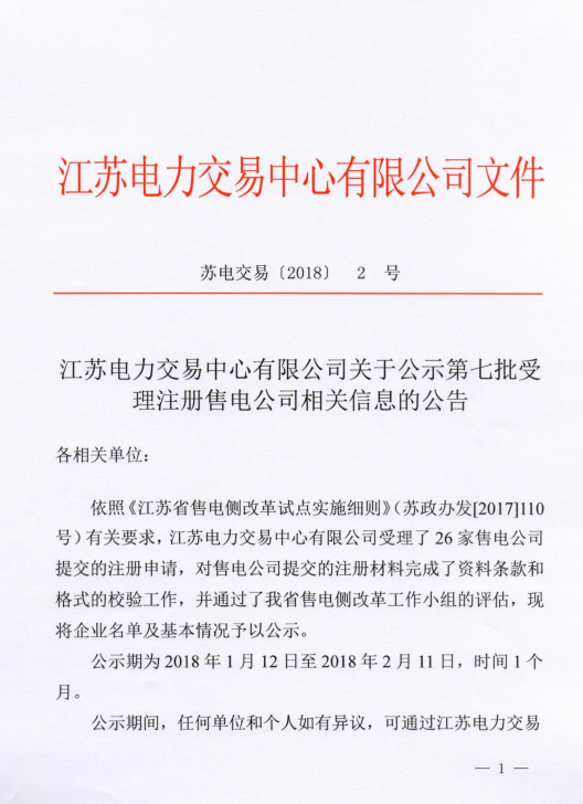 江蘇電力交易中心日前發(fā)布了《關(guān)于公示第七批受理注冊售電公司相關(guān)信息》的公告,公告中稱,江蘇電力交易中心受理了26家售電公司提交的注冊申請,公示期為2018年1月12日至2018年2月11日,時間1個月。詳情如下: