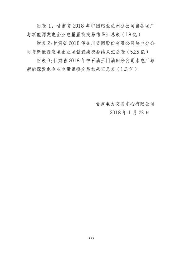 《2018年甘肅蘭鋁、金川集團(tuán)、玉門石油自備電廠與新能源發(fā)電企業(yè)電量置換交易結(jié)果公告(2018年1月23日)》