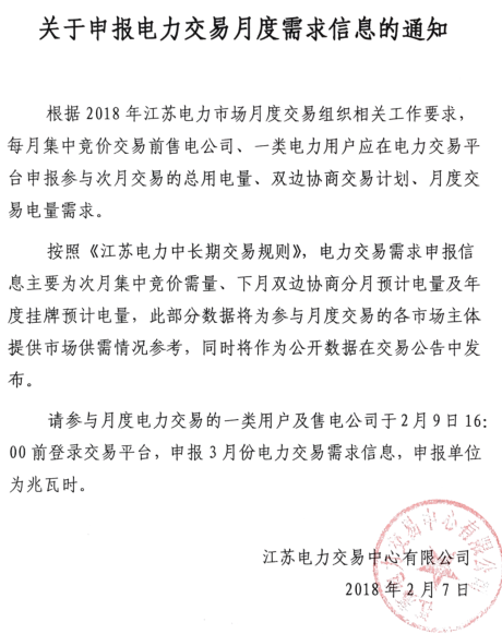 江蘇電力交易中心日前發(fā)布了《關(guān)于申報電力交易月度需求信息的通知》, 通知中稱,請參與月度電力交易的一類用戶及售電公司于2月9日16:00