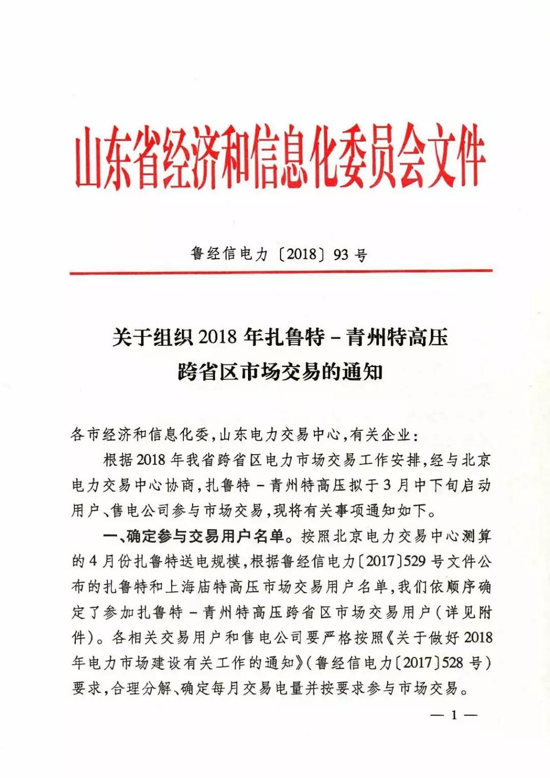 山東省經(jīng)信委日前發(fā)布了《關(guān)于組織2018年扎魯特-青州特高壓跨省區(qū)市場(chǎng)交易的通知》,通知中稱,扎魯特-青州特高壓擬于3月下旬啟動(dòng)用戶、售