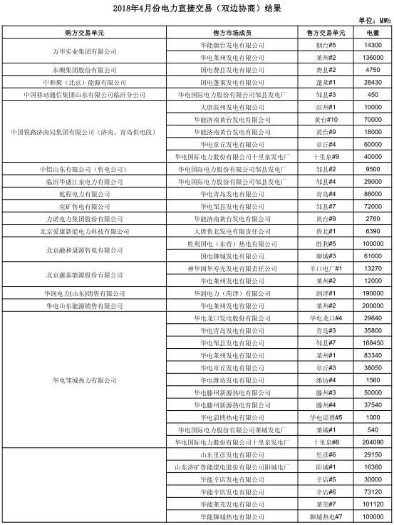 山東2018年4月雙邊協(xié)商交易:交易電量5072690兆瓦時(shí)