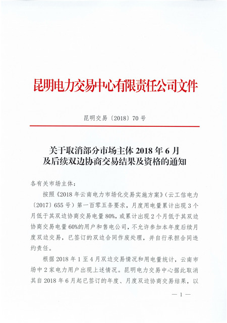 云南取消2家電力用戶6月及后續(xù)雙邊協(xié)商交易結(jié)果及資格