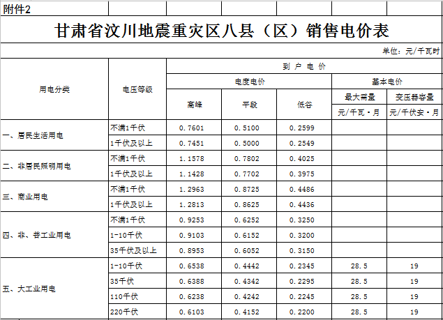 對省內(nèi)一般工商業(yè)用電(除汶川地震重災(zāi)八縣區(qū)非居民照明、非普工業(yè)用電)價(jià)格,在現(xiàn)行標(biāo)準(zhǔn)基礎(chǔ)上每千瓦時(shí)統(tǒng)一降低1.74分錢;汶川地震重災(zāi)八縣區(qū)商業(yè)用電價(jià)格,在現(xiàn)行標(biāo)準(zhǔn)基礎(chǔ)上每千瓦時(shí)統(tǒng)一降低4.77分錢。調(diào)整后的銷售電價(jià)表詳見附件1、2。