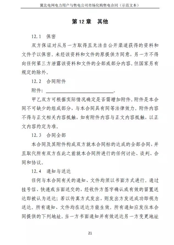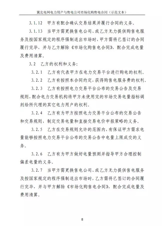 冀北電力交易中心日前發(fā)布了《冀北電網(wǎng)售電公司與電力用戶購(gòu)售電合同示范文本的通知》,冀北電網(wǎng)區(qū)域內(nèi)電力用戶和售電公司達(dá)成市場(chǎng)化購(gòu)電的