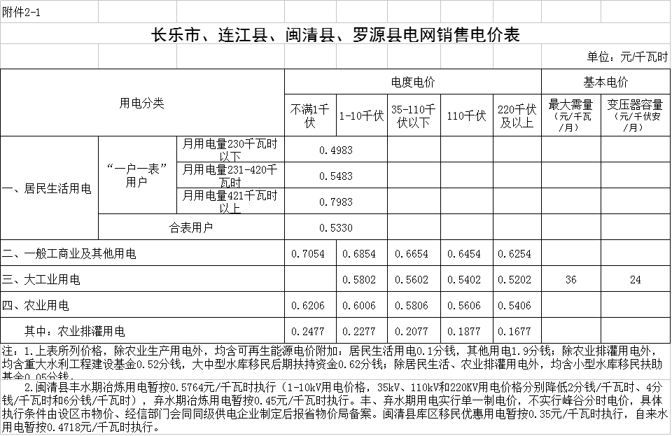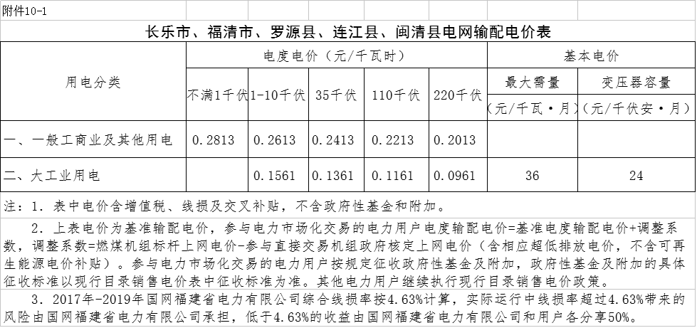 福建再次調(diào)整一般工商業(yè)電價(jià)(附各市區(qū)縣電價(jià)詳表)