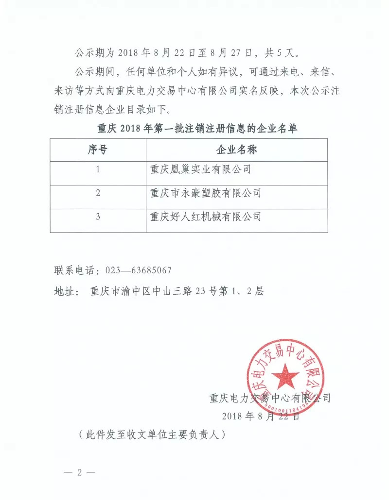重慶電力交易中心日前發(fā)布了《關(guān)于注銷(xiāo)電力用戶(hù)注冊(cè)信息的公告(2018年第一批)》,售電公司與用戶(hù)雙方協(xié)商簽訂合同終止協(xié)議,重慶電力交易中心有限公司受理了重慶凰巢實(shí)業(yè)有限公司、重慶市永豪塑膠有限公司、重慶好人紅機(jī)械有限公司3家企業(yè)注銷(xiāo)注冊(cè)信息申請(qǐng),現(xiàn)對(duì)企業(yè)名單予以公示。公示期為2018年8月22日至8月27日,共5天。詳情如下: