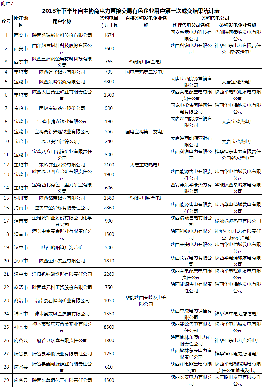 按照《關(guān)于印發(fā)陜西省電力用戶與發(fā)電企業(yè)直接交易實施細則(暫行)的通知》(陜發(fā)改運行〔2014〕1174號)、《關(guān)于完善用電政策促進有色金屬工業(yè)調(diào)結(jié)構(gòu)促轉(zhuǎn)型增效益有關(guān)工作的通知》(發(fā)改能源〔2016〕2462號)、《陜西省售電側(cè)改革試點實施細則(暫行)》等文件精神及要求,我委組織開展了2018年下半年自主協(xié)商模式電力直接交易工作,經(jīng)市場主體自主協(xié)商并提交意向性協(xié)議、電網(wǎng)安全校核,現(xiàn)將第一次交易結(jié)果通知如下: